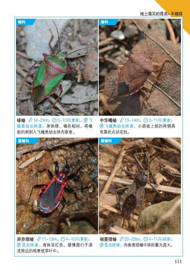 以地面、叶子、花、树、水、夜晚等6个昆虫栖息环境为区分,收录了在这些环境中常见生活的21目221科1004种昆虫。