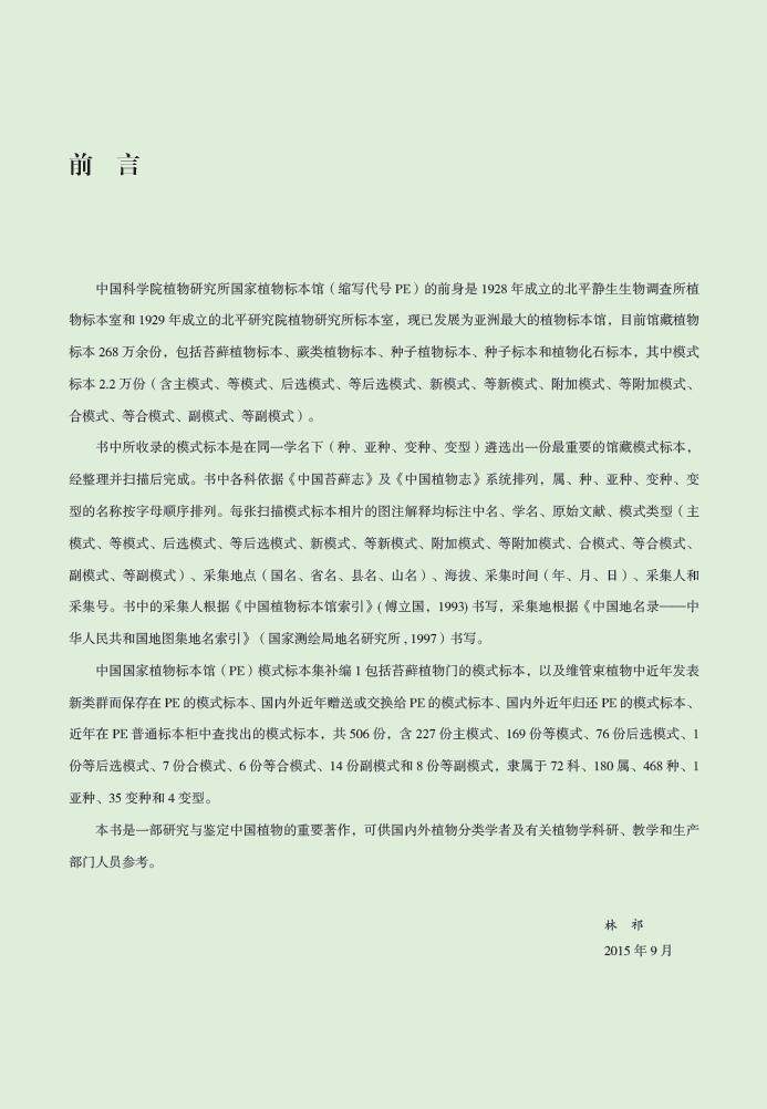 中国国家植物标本馆(PE)模式标本集:补编1本套书是在近2万份模式标本中遴选出一份最重要的馆藏模式标本,共计7740份, 扫描成7740幅超高清彩色照片,经整理后编撰而成,为国内乃至东亚最全植物模式标本汇集。是植物分类研究者的重要参考书。