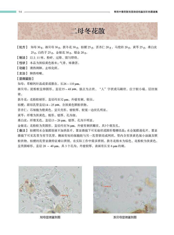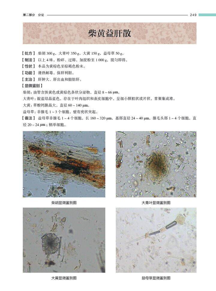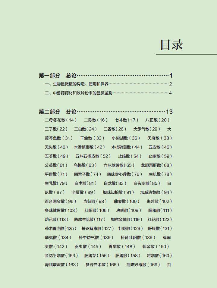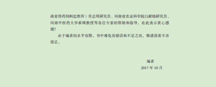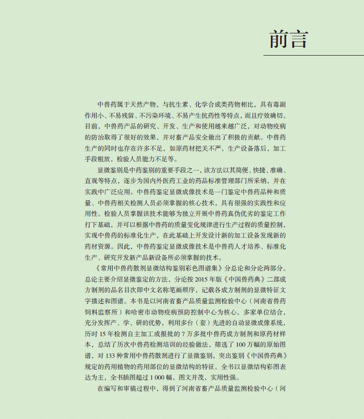本书中的中兽药散剂的显微图谱,是作者及其团队利用河南省兽药报批样品的检验与自制原药材标本、自配成方制剂标准图谱相结合,11人历时12年对35000多批的样品分析观察,每个品种都选用了不同来源的三批以上的样品,多者达400批以上,采用显微成像系统4台,取得的相应高质量的图谱,期间培养检验员4000名。完成了100种中兽药散剂的显微图谱分析,撰写成“常用中兽药显微图谱集”,一方面可为中兽药的质量研究提供一些参考资料,同时也是为中兽药检验与标本建设打好基础。