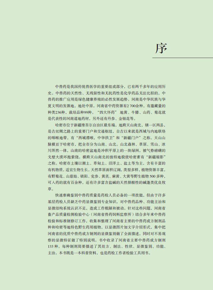 显微图片加文字介绍,图片丰富,内容详实。书中内容河南省主要的中兽药成方制剂品种和哈密等地特色野生药用植物。既是一本科普资料,也是药检工作者检验工具用书。