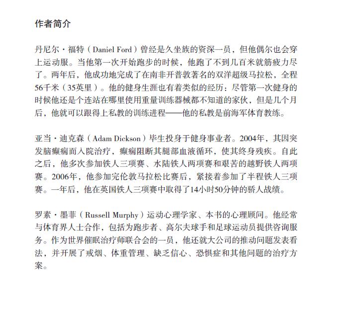 本书的作者,深知您想要通过锻炼获得健康,却迟迟没有采取行动。您的生活十分忙碌,锻炼这件事需要您生活中的其他人和事配合,如朋友、伴侣、孩子、工作和其他责任。也许您锻炼只是为了享受乐趣,就像与朋友出去吃顿饭或者出去玩儿一晚一