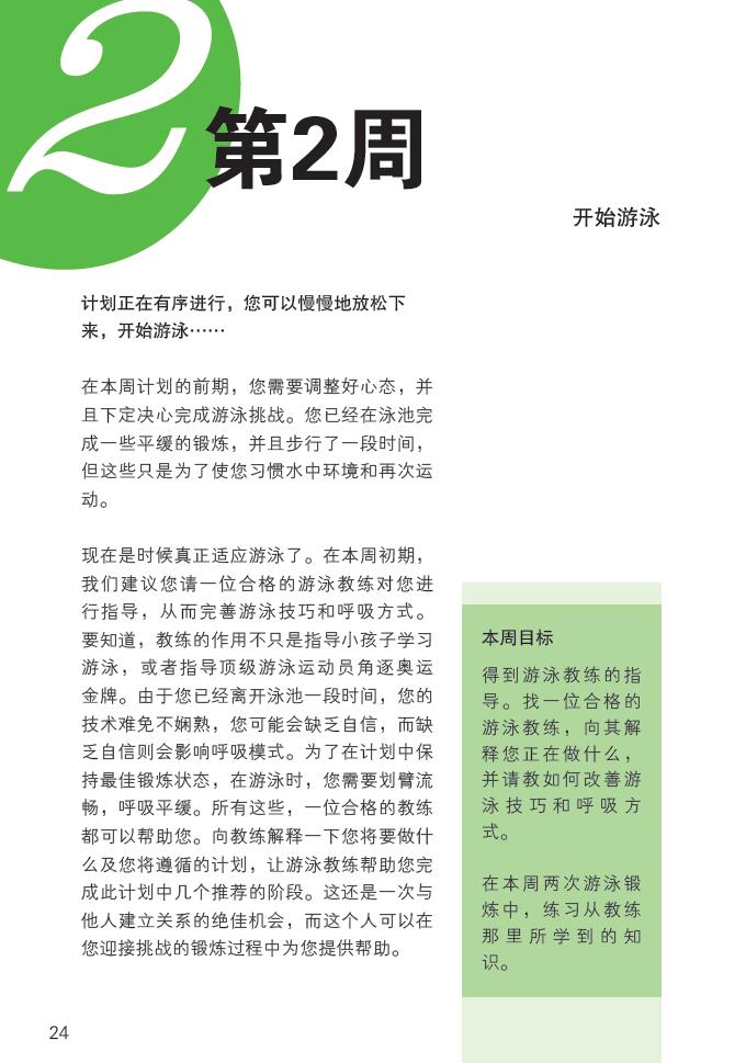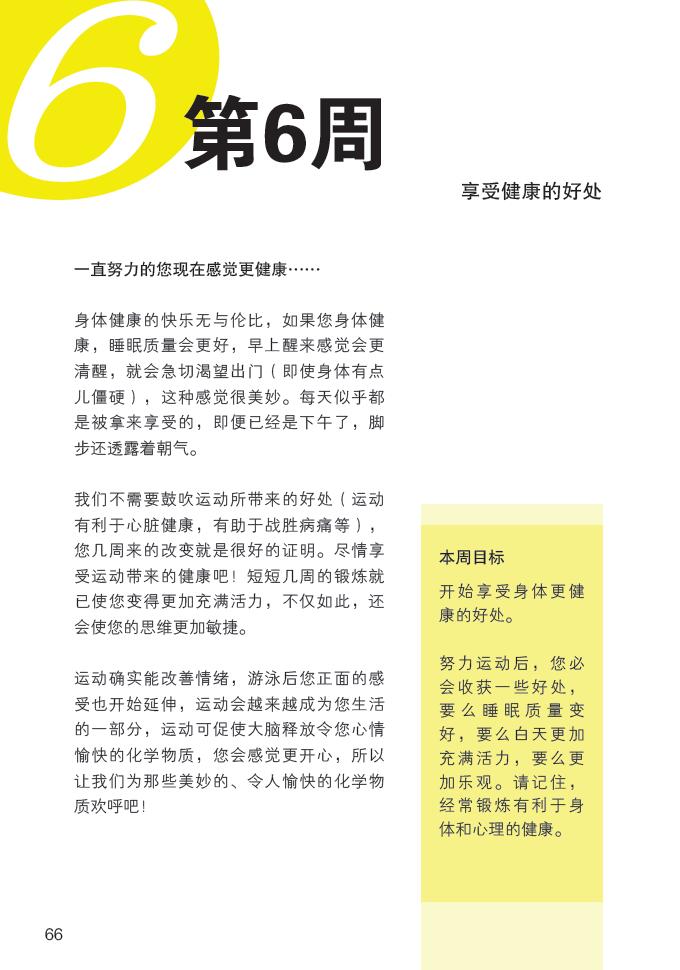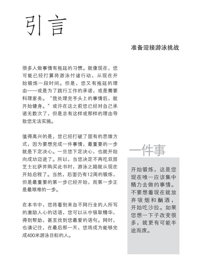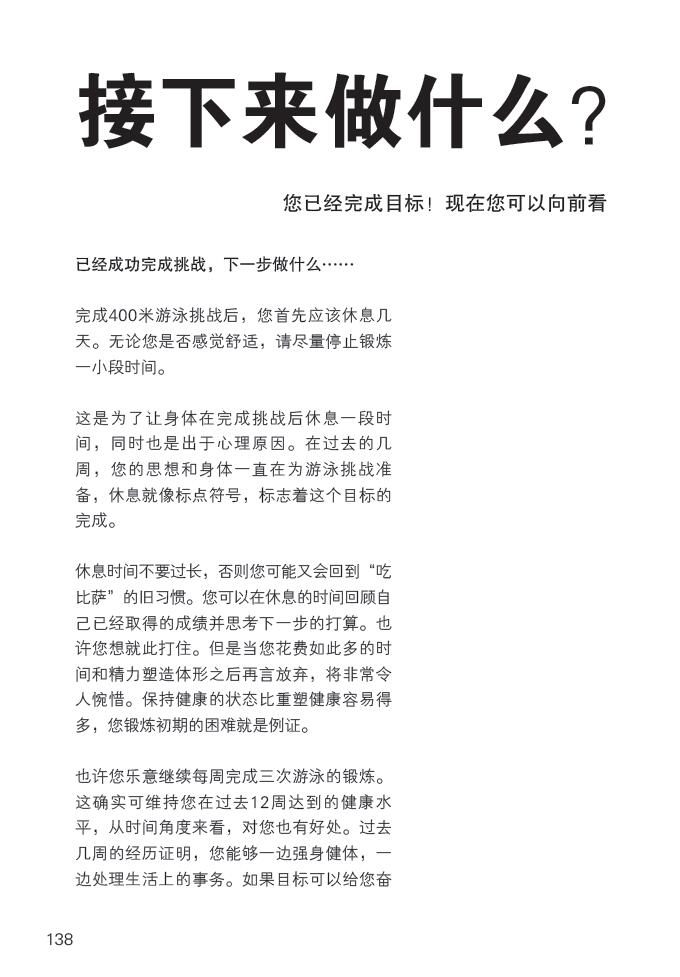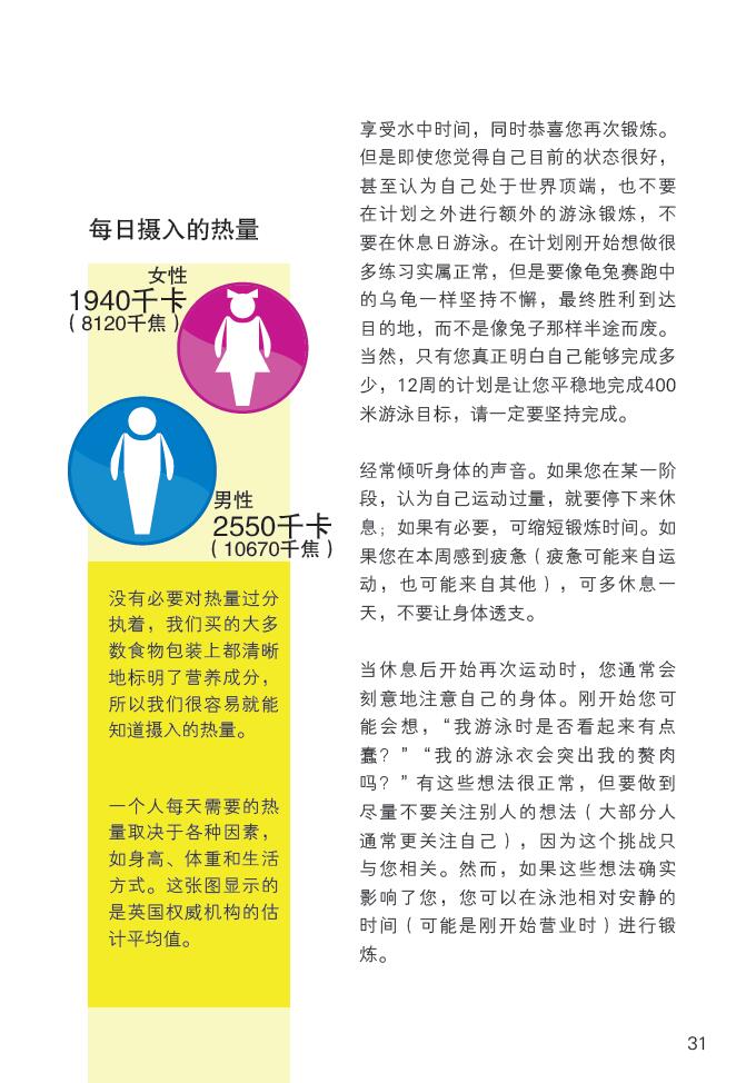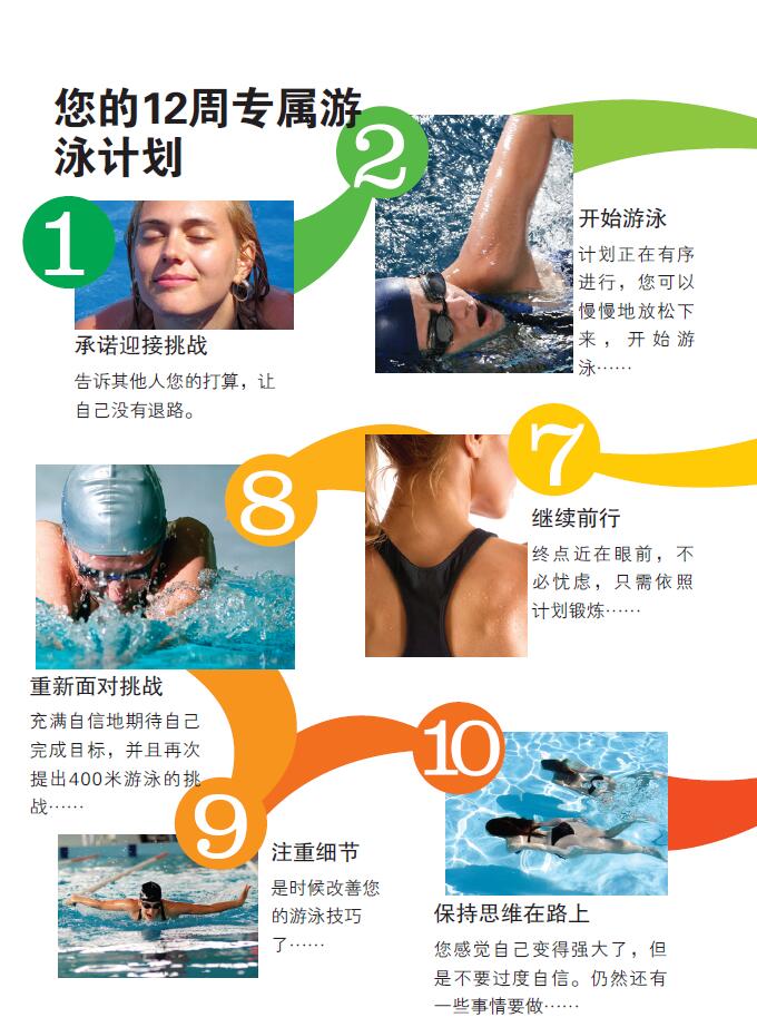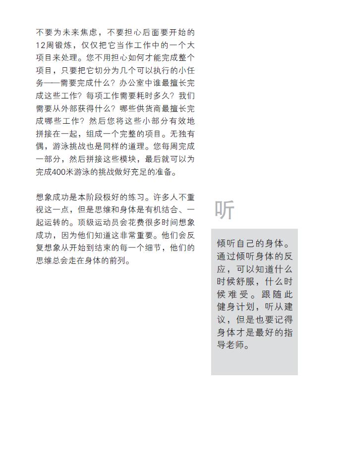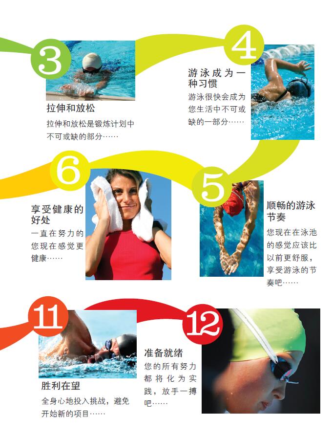 《12周科学游泳指南》以周为基础,每周一部分,共分为12部分。每一部分包括简短的概述(讲述这一周需要重点关注的内容),在上一周末阅读这部分内容可以有足够的准备、消化时间。接下来是本周的训练计划、目标、取得的成绩,涵盖饮食、精神、睡眠等内容。通过12周循序渐进地训练,最终达成目标,轻松游完400米。