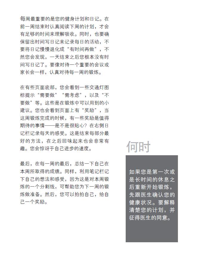 ①内容通俗易懂、锻炼安排合理科学,既保证了锻炼时间也保证了休息时间。②除了教练还有心理专家也参与了本书的编写,所以,书中为您考虑了如何才能坚持锻炼下去,如何才是科学合理的锻炼,以及如何养成良好的锻炼习惯。③四色印刷,图片精美;开本较小,可以随身携带。
