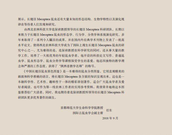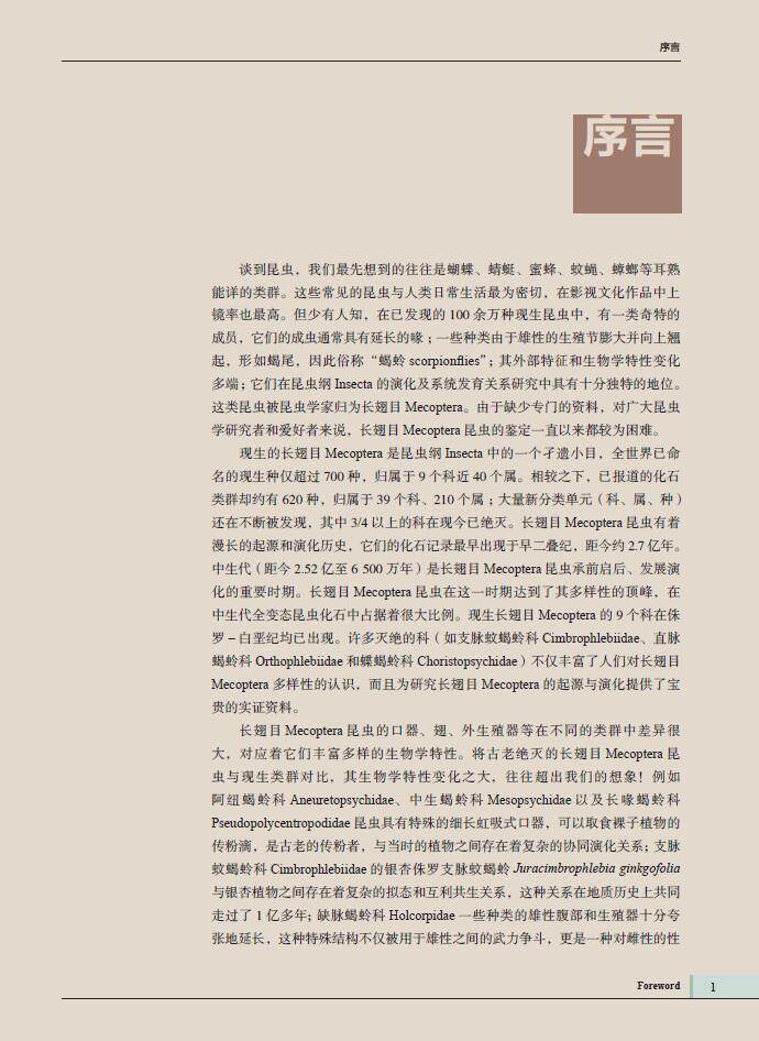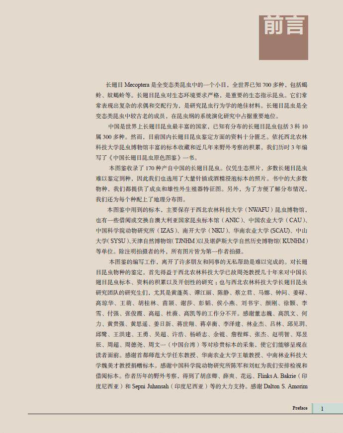 翅目昆虫研究进展的系统总结。共收录产自中国的长翅目昆虫 3 科 10 属 170种 ;系统编制了本图鉴收录的中国长翅目昆虫分科、分属和分种检索表 ;概述部分介绍了长翅目昆虫的分类地位、研究简史、分类系统、地理分布、形态特征、生物学和生态学特性等 ;每种昆虫介绍了中名、拉丁学名、测量数据、形态特征、发生期、地理分布等,并提供有成虫生态照片或标本照片,雄性外生殖器图片以及地理分布图。本图鉴是世界上第·一部长翅目昆虫分类研究的重要著作,全图鉴中英文对照 , 可作为昆虫学工作者及爱好者的重要参考资料。