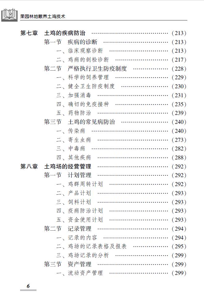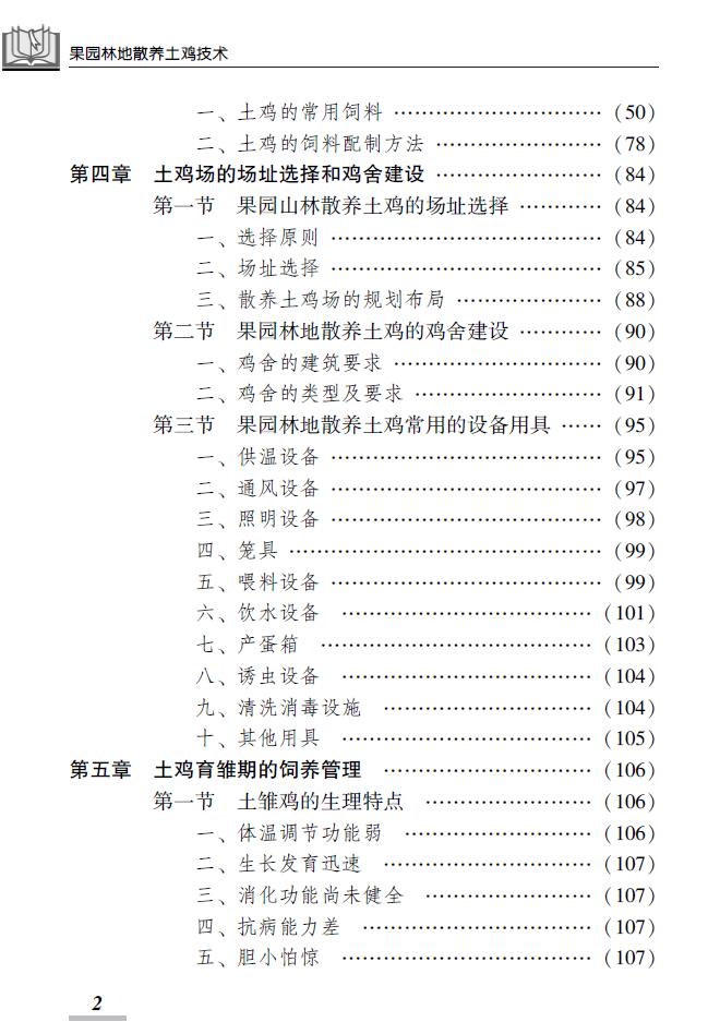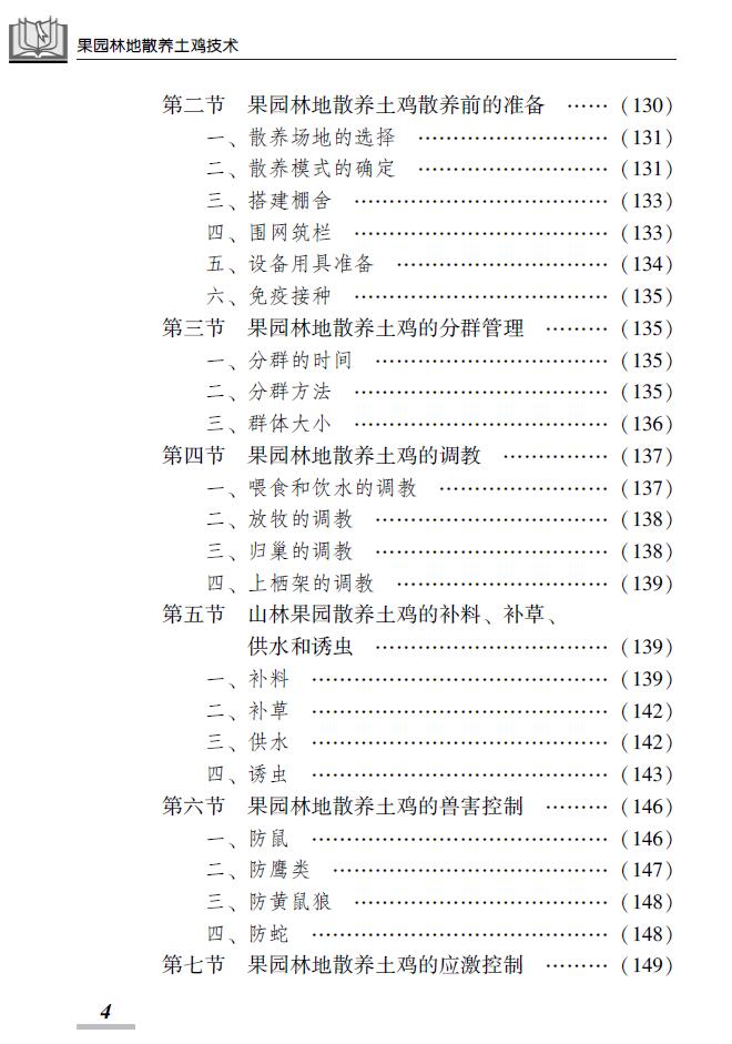 本着实用、全面、先进的宗旨, 对第1 版做了增删和调整。修订后本书内容包括八章, 分别是果园林地散养土鸡的优势及现状、土鸡的外貌特征及品种选择、土鸡的营养需要与日粮配制、土鸡场的场址选择和鸡舍建设、土鸡育雏期的饲养管理、土鸡散养期的饲养管理、土鸡的疾病防治和土鸡场的经营管理, 并在附录中增添了生态散养土鸡操作管理规程(新乡市地方标准)。 本书紧扣生产实际, 注重系统性、科学性、实用性和先进性, 内容新颖系统, 重点突出, 通俗易懂, 不仅适宜土鸡场饲养管理人员和广大土鸡养殖户阅读, 也可以作为大专院校和农村函授及培训班的辅助教材和参考书。
