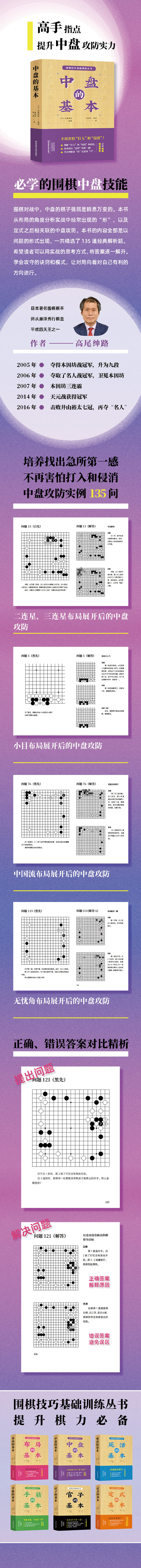 中盘的基本日本围棋一流高手高尾绅路,针对初中级围棋爱好者,从实战的角度以问答的形式讲解围棋所需各项技能,图文对照,分析精细,易于理解。套书分为6册,分别为:手筋、死活、定式、布局、中盘、收官,针对围棋各个阶段所需的基本技能共计例举了近800个问题,针对各种问题比对错误和正确的方法,避免读者在对局中走入误区。本书为“手筋”分册。