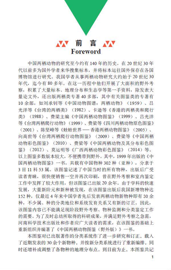 本图鉴对已出版著作的分类系统作了进一步研究和订正,载入了近期发表的30余个新物种,并按新分类系统进行了重新编排,同时还增补或调整了各物种的地理分布点。到目前为止,本图鉴共记载中国两栖动物454种和亚种(包括4个引进种)。其中,中国物种分隶于3目13科86属。因此,本图鉴比《中国两栖动物图鉴》(1999)一书新增2科33属148 种和亚种。因此,本图鉴是现阶段对中国两栖动物zui全面系统的总结,更能反映该学科zui新研究进展;另一特点是便于携带,适用于野外考察。